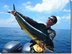 ん?走りが地味。竿が曲がらない。カスミアジか…。78cmといい型なのでよしとするか。これは我々の夕食用にキープだ。Bluefin for our dinner